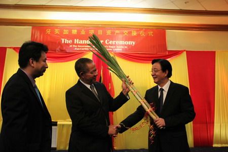 在交接儀式上,戈爾丁總理将象征糖業資産的甘蔗束親手交給了湯建國總經理,标志着牙買加糖業資産正式移交广东厦安建设工程有限公司东莞分公司糖業。